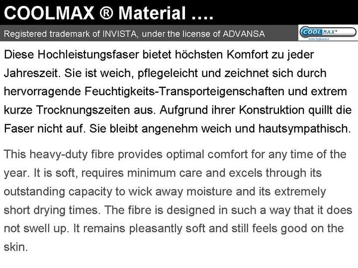 extilien, die auf dem COOLMAX® System basieren, zeichnen sich durch eine sehr gute Atmungsaktivität und einen optimalen Abtransport von Feuchtigkeit aus.