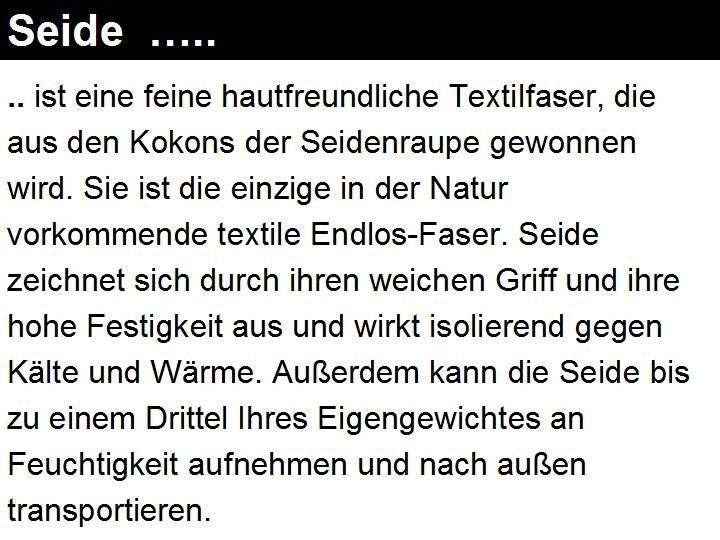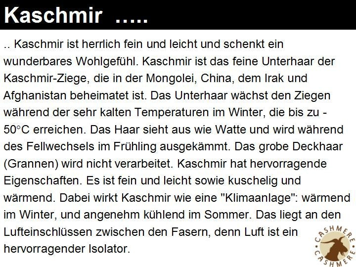 Material: * 56% Kaschmir * 24% Seide * 20% Polyamid Artikelnummer : 10-4271