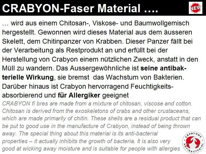 Crabyon(r)-Fasern sind natürlich gewonnene Fasern aus dem Chitinpanzer von Krabben und wirken antibakteriell, was das Wachstum von Bakterien eindämmt und Feuchtigkeit abtransportiert;