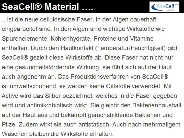 * Umweltfreundliche SeaCell(r)-Technologie bietet hoch entwickelte Fasern, die Algen enthalten und bei Hautkontakt Spurenelemente, Kohlenhydrate, Proteine und Vitamine abgeben